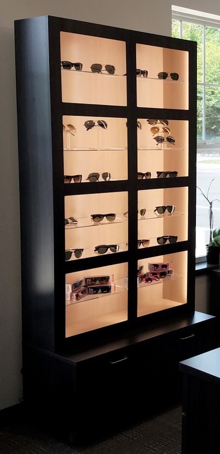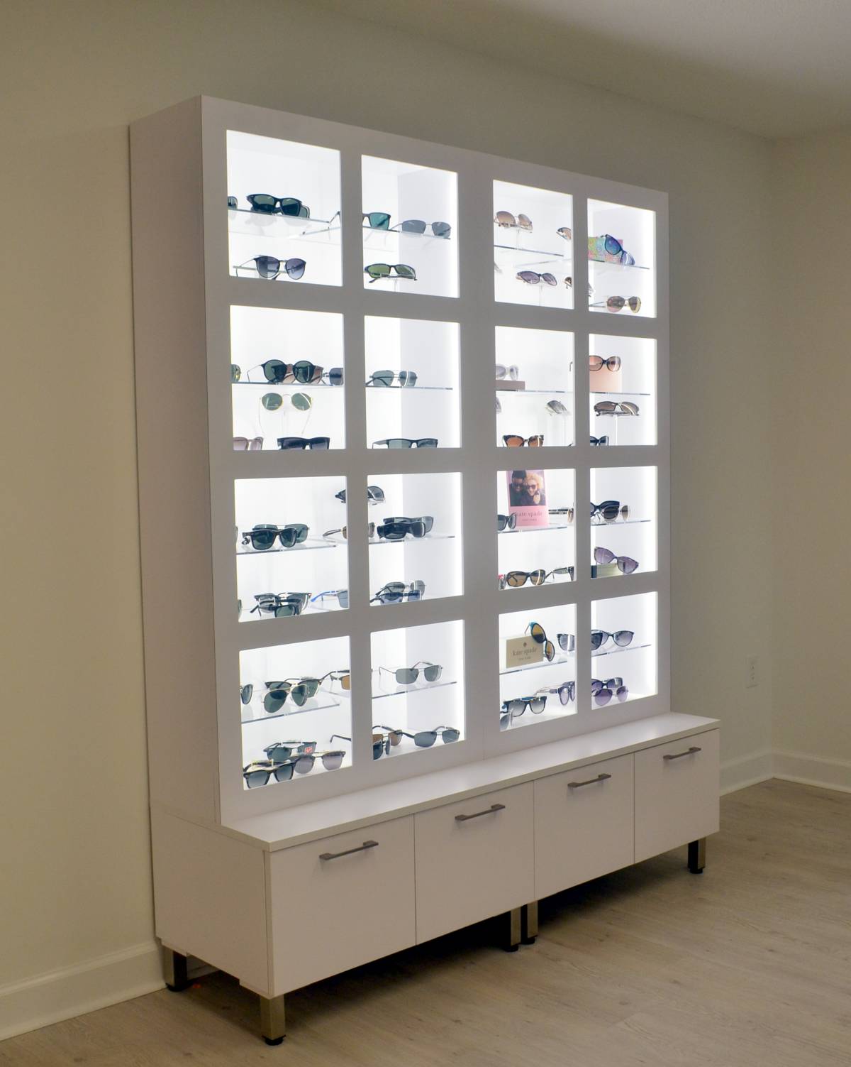 Cubby display with bright LED lighting, acrylic shelves, and file drawers on the bottom row.